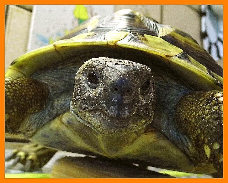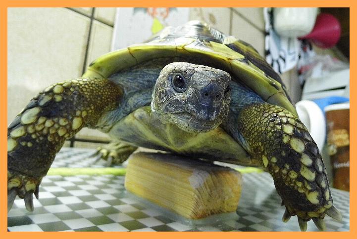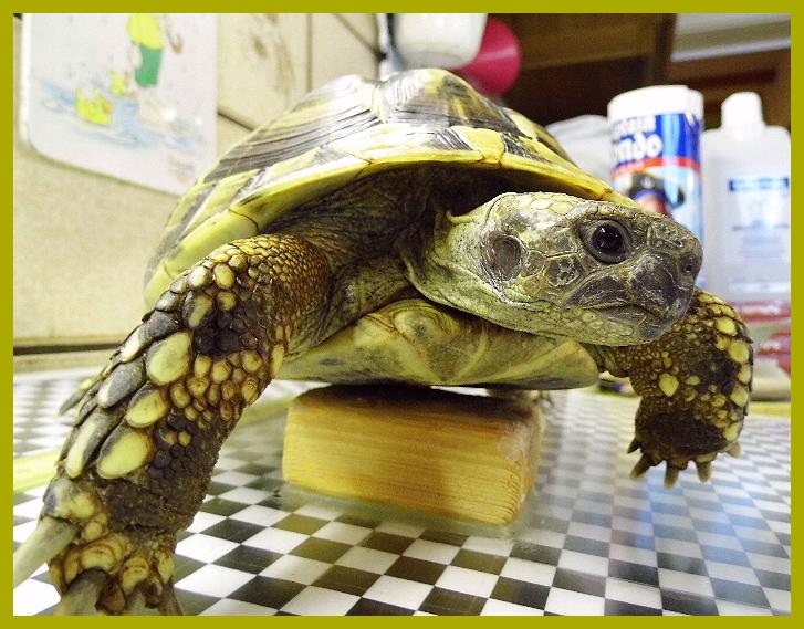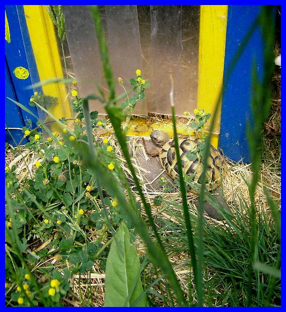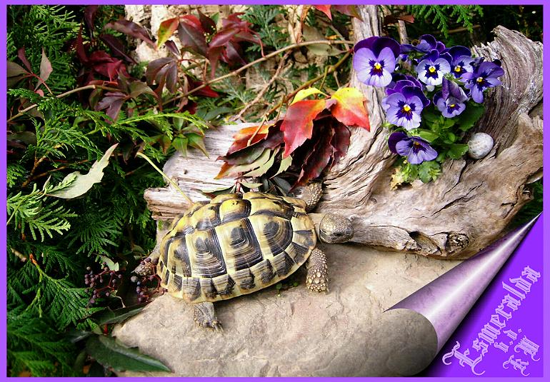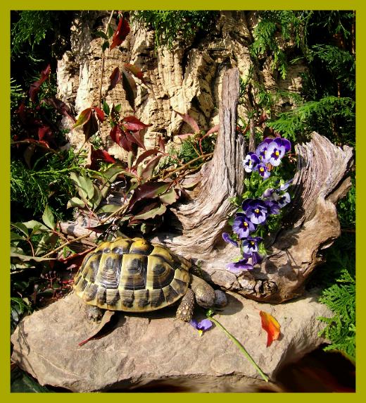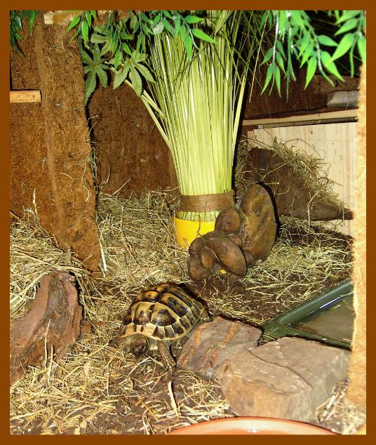 Auch im 5,8 x 0,8 Meter großen Terrarium, nach dem Winterschlaf, begrüßt Esmeralda mit ausführlichen Wanderungen das neue Schildkrötenjahr.   |